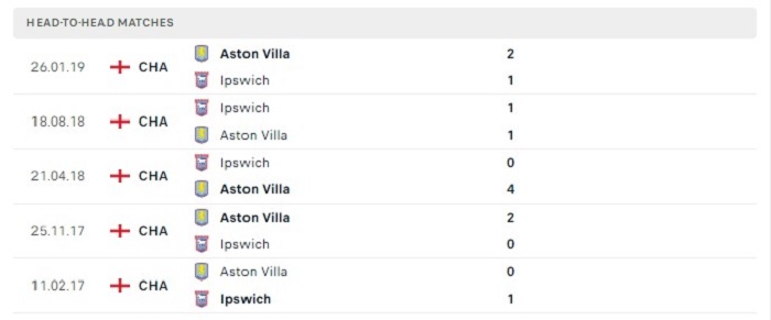 Quá khứ cũng không hề đứng về phía Ipswich trong những lần gặp nhau trước đây của hai đội, cụ thể có thể nhận thấy được khi Ipswich chỉ thắng 1 và hoà 3 trong khi thua tới 6 trận đấu trước Aston Villa theo mốc kèo châu Âu của trận đấu. Thực lực của Aston Villa ở mùa giải năm nay đang được thể hiện khi đội bóng chủ sân Villa Park có được 4 trận thắng sau 5 vòng đấu của mình, do vậy mà khả năng Aston Villa có thêm một chiến thắng theo kèo châu Âu trước Ipswich cũng là điều nằm trong tầm tay của họ.