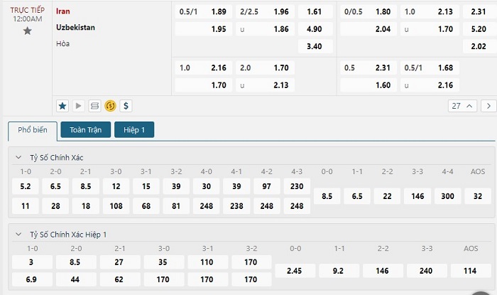 Bảng tỷ lệ kèo bóng đá trận đấu Iran vs Uzebekistan