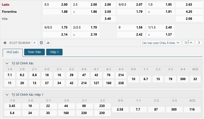 Đang có cho mình được lợi thế về mặt sân nhà giúp Lazio chính là cái tên được sự đánh giá cao từ giới chuyên môn. Mặc dù vậy đây sẽ là thử thách không phải quá dễ dàng với đội chủ nhà bởi Fiorentina mùa này họ cũng đang thể hiện được phong độ và bộ mặt hoàn toàn khác của mình những mùa giải trước, bên cạnh đó với Fiorentina họ cũng sẽ thể hiện quyết tâm để có được điểm số cho mục tiêu chen chân vào top 5 dẫn đầu do vậy mà với kéo châu Á hiện tại đội khách sẽ là lựa chọn không tồi.