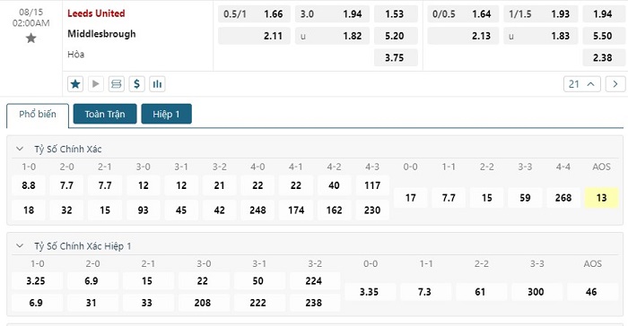 Bảng tỷ lệ kèo bóng đá trận đấu Leeds United vs Middlesbrough