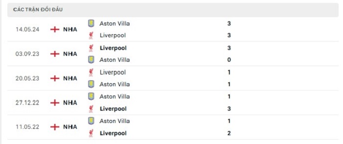 Lịch sử đối đầu của Liverpool vs Aston Villa
