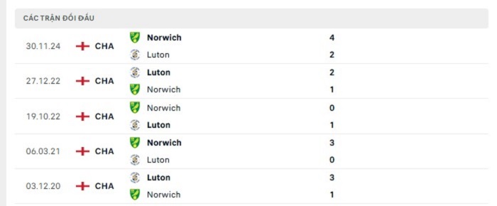 Lịch sử đối đầu của Luton Town vs Norwich City