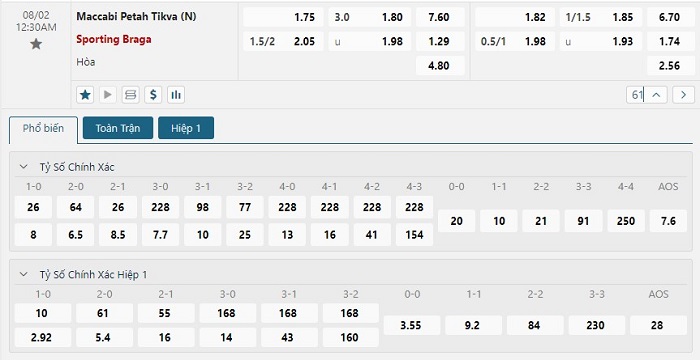Bảng tỷ lệ kèo bóng đá trận đấu Maccabi Petah Tikva vs Sporting Braga