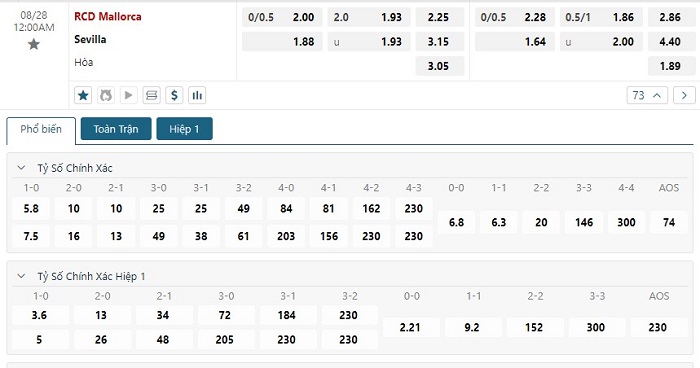 Bảng tỷ lệ kèo bóng đá trận đấu Mallorca vs Sevilla