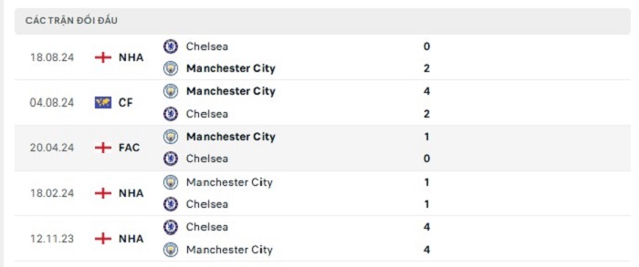 Bảng  bóng đá trận đấu Manchester City vs Chelsea
