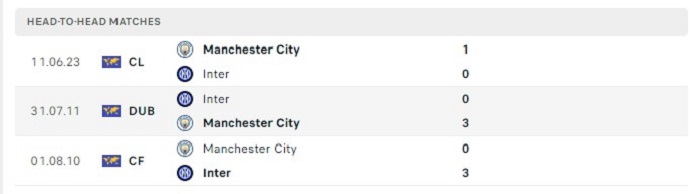 Những lần gặp nhau giữa Manchester City và Inter Milan vốn cũng không có quá nhiều bàn thắng ghi được khi chỉ có từ 3 bàn thắng trở xuống, đáng nói là tại Champions League trước đây của hai đội cũng chỉ duy nhất 1 bàn thắng được ghi trong lần gặp nhau đó, hiện tại cả Manchester City và Inter Milan có hàng thủ cũng khá chắc chắn trong những trận đấu của mình do vậy mà tỷ số trận đấu cũng sẽ khó có thể xuất hiện nhiều trong trận.