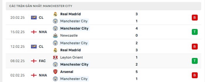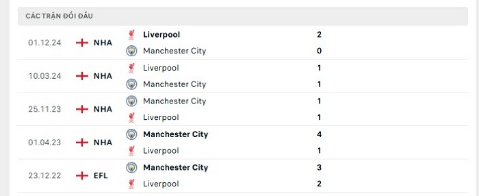 Bảng bóng đá trận đấu Manchester City vs Liverpool