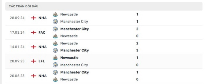 Bảng bóng đá trận đấu Manchester City vs Newcastle