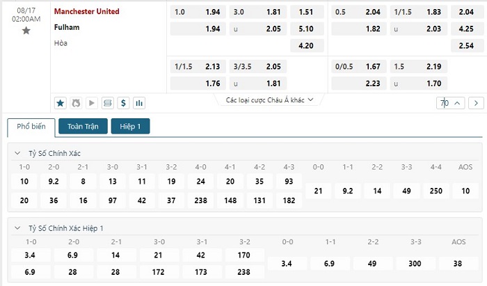 Bảng tỷ lệ kèo bóng đá trận đấu Manchester United vs Fulham