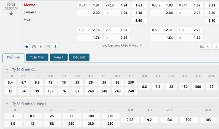Bảng tỷ lệ kèo bóng đá trận đấu Mexico vs Jamaica