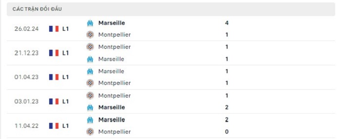Bảng bóng đá trận đấu Montpellier vs Marseille