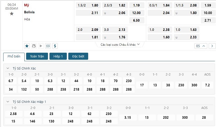 Bảng tỷ lệ kèo bóng đá trận đấu Mỹ vs Bolivia