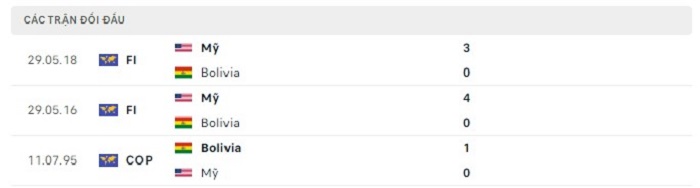 Những lần gặp nhau trước đây của hai đội Mỹ vẫn chiếm ưu thế rõ ràng trước Bolivia với 2 trận toàn thắng kèo châu Âu gần đây nhất và chỉ thua 1. Có thể thấy được sự áp đảo từ phía tuyển Mỹ trong những năm gân đây trước Bolivia về chuyên môn cũng như chất lượng về mặt đội hình. Vì vậy mà khả năng có được một thắng lợi theo kèo châu Âu với tuyển Mỹ là điều đang nằm trong tầm tay của họ.
