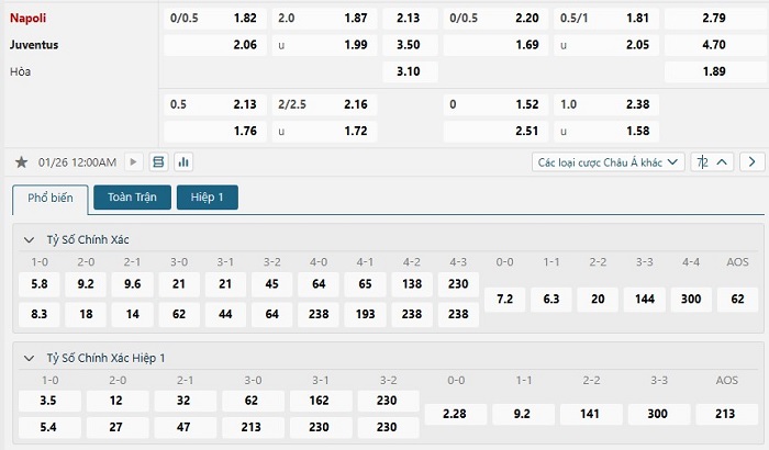 Soi kèo châu Á, kèo chấp Napoli vs Juventus