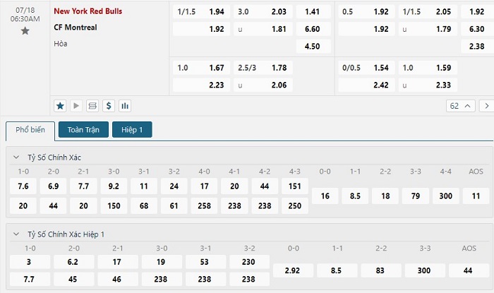 Bảng tỷ lệ kèo bóng đá trận đấu New York Red Bulls vs CF Montreal