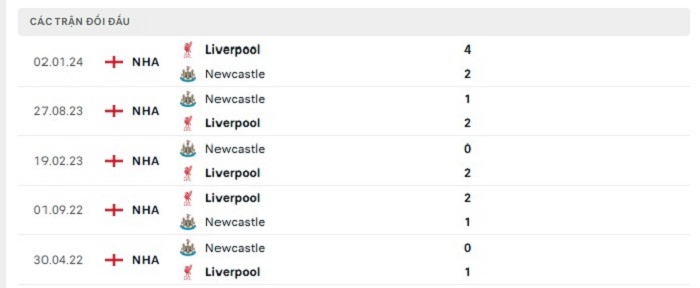 Bảng bóng đá trận đấu Newcastle United vs Liverpool