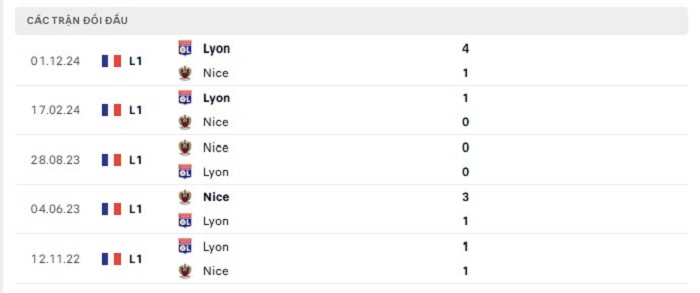 Bảng bóng đá trận đấu Nice vs Lyon
