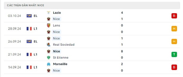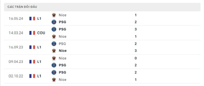 Bảng bóng đá trận đấu Nice vs Paris Saint Germain