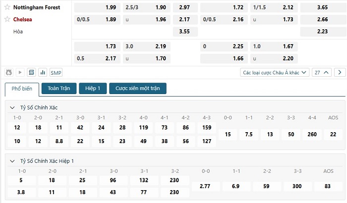 Bảng tỷ lệ kèo bóng đá trận đấu Nottingham vs Chelsea