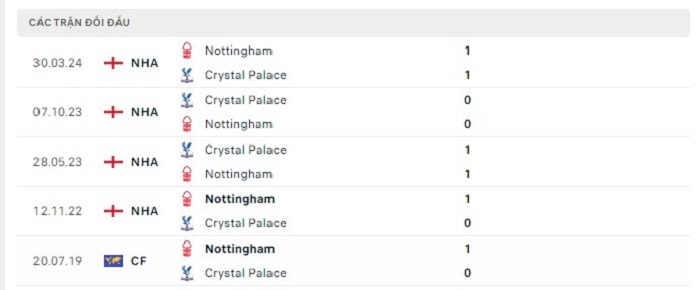 Giữa Nottingham và Crystal Palace trong quá khứ cũng đã cho thấy được sự cân bằng rất đáng kể ở những lần gặp nhau trước đây, cụ thể là có tới 5 trận đấu giữa hai đội trong quá khứ có được thành tích bất bại, trong đó 3 lần gặp nhau liên tiếp gần đây của hai đội gần đây có kết quả hoà kèo châu Âu cả trận, chính bởi lý do này mà trận đấu giữa Nottingham và Crystal Palace sắp tới cũng sẽ khó có thể bất phần thắng bại.