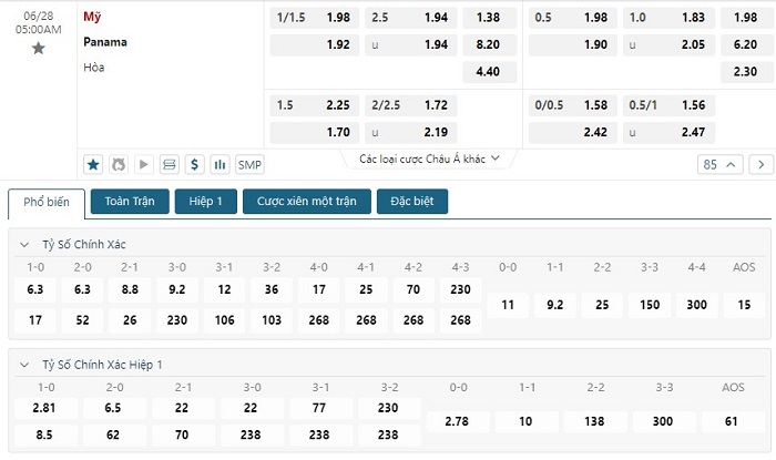 Bảng tỷ lệ kèo bóng đá trận đấu Panama vs Mỹ