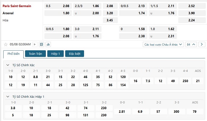 Bảng tỷ lệ kèo bóng đá trận đấu Paris Saint-Germain vs Arsenal