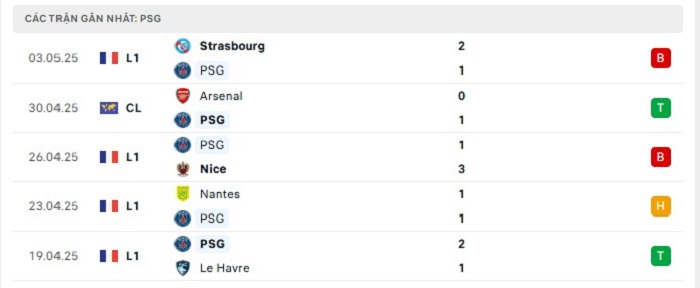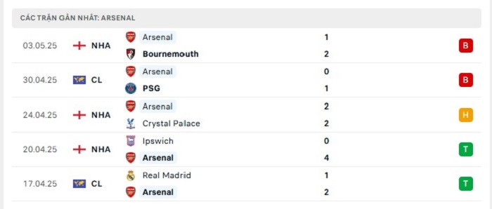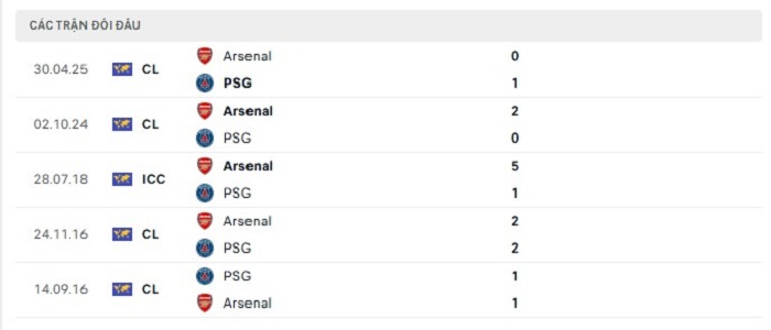 Phong độ gần đây Paris Saint-Germain vs Arsenal