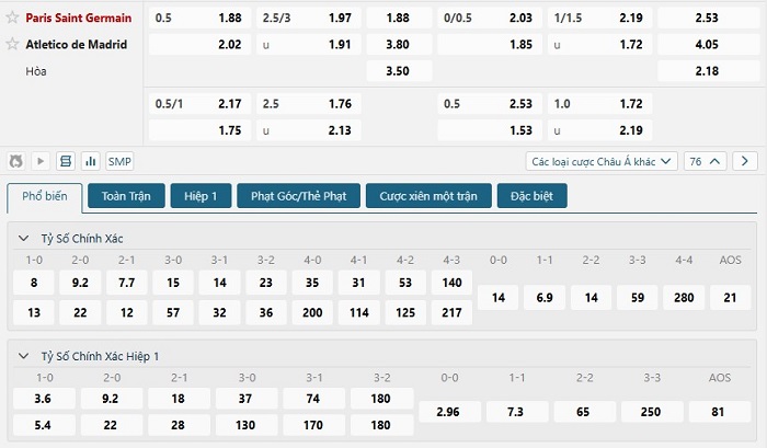 Bảng tỷ lệ kèo bóng đá trận đấu Paris Saint Germain vs Atletico Madrid