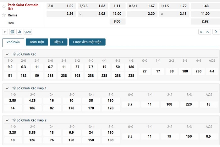 Bảng tỷ lệ kèo bóng đá trận đấu Paris Saint Germain vs Reims