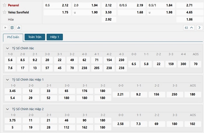 Bảng tỷ lệ kèo bóng đá trận đấu Penarol vs Velez Sarsfield