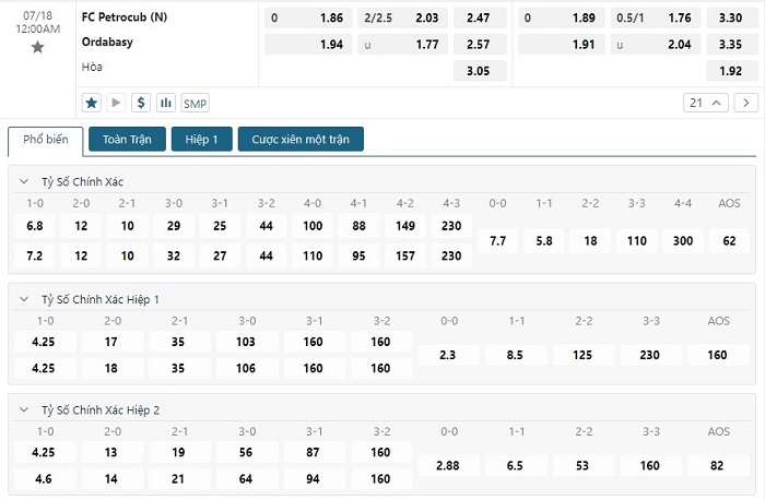 Bảng tỷ lệ kèo bóng đá trận đấu Petrocub vs Ordabasy