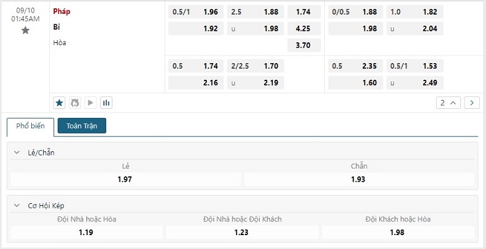 Bảng tỷ lệ kèo bóng đá trận đấu Pháp vs Bỉ
