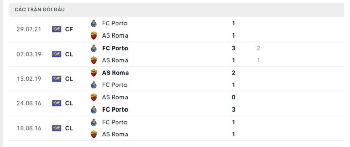 Bảng bóng đá trận đấu Porto vs AS Roma