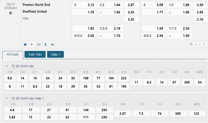 Bảng tỷ lệ kèo bóng đá trận đấu Preston North End vs Sheffield United