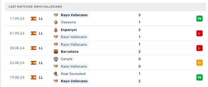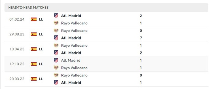 Phong độ gần đây Rayo Vallecano vs Atletico Madrid