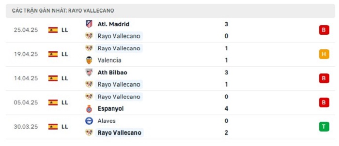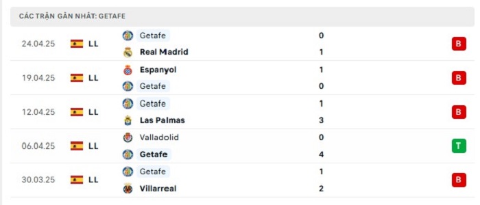 Phong độ gần đây Rayo Vallecano vs Getafe
