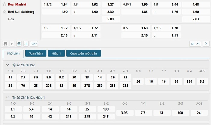 Bảng tỷ lệ kèo bóng đá trận đấu RB Salzburg vs Real Madrid
