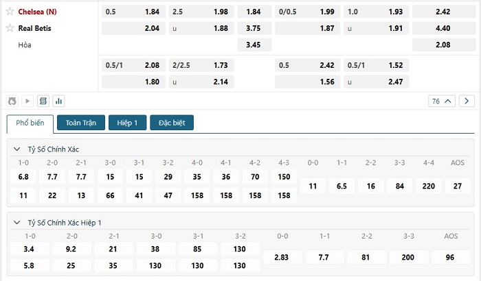 Bảng tỷ lệ kèo bóng đá trận đấu Real Betis vs Chelsea