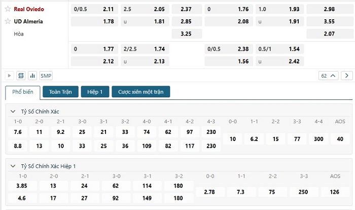 Bảng tỷ lệ kèo bóng đá trận đấu Real Oviedo vs Almeria