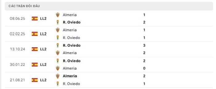 Thành tích trong quá khứ giữa Real Oviedo và Almeria vốn cũng không chênh lệch nhiều với nhau, thật vậy kh mà đội chủ nhà thắng 4, hoà 3 thì cũng thua 2 theo mốc kèo châu Âu được niêm yết. Real Oviedo ở mùa giải dù xếp thứ 3 nhưng cũng có tới 12 trận đấu bất phân thắng bại theo kèo châu Âu bằng với con số mà Almeria có được ở giải đấu, chính bởi vậy mà không loại trừ khả năng chia điểm của hai đội ở lần gặp nhau này.