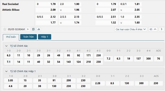 Bảng tỷ lệ kèo bóng đá trận đấu Real Sociedad vs Athletic Bilbao
