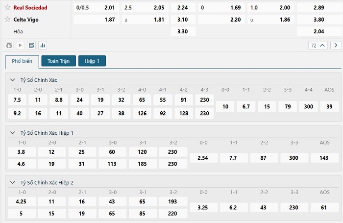 Bảng tỷ lệ kèo bóng đá trận đấu Real Sociedad vs Celta Vigo