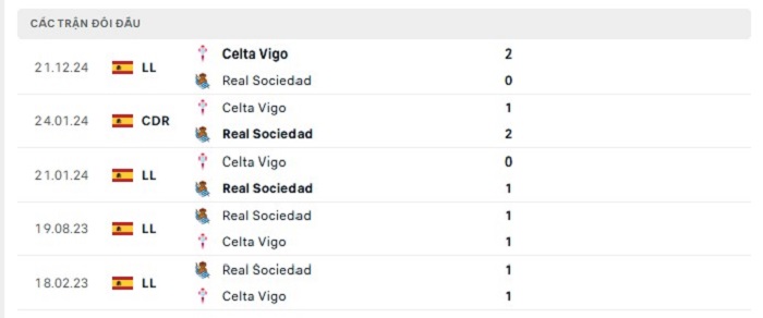 Lịch sử đối đầu của Real Sociedad vs Celta Vigo