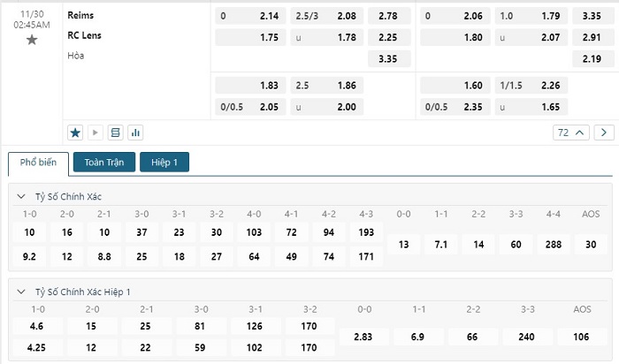 Vẫn biết là trong quá khứ Reims từng gặp không ít những khó khăn khi chưa thể đánh bại Lens trong 10 lần gặp nhau gần đây giữa hai đội. Nhưng dù vậy Reims cũng từng tạo nên không ít những khó khăn cho đối thủ với 4 trận đấu hoà kèo châu Âu cả trận. Ở mùa giải năm nay Lens cũng nhận số trận hoà kèo châu Âu tương đối nhiều với tổng cộng 5 trận đấu có kết quả hoà, do vậy mà khả năng bất phân thắng bại của hai đội ở lần gặp nhau sắp tới cũng là điều khả thi.
