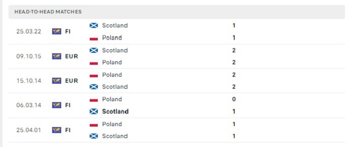 Những lần gặp nhau trước đây giữa Scotland và Ba Lan vốn cũng đã cho thấy sự cân bằng đáng kể của họ. Thật vậy bởi dù Scotland có được ưu thế hơn khi có được 1 chiến thắng nhưng hai đội cũng có tới 3 trận đấu hoà kèo châu Âu trong 4 lần gặp nhau gần đây. Scotland thời gian gần đây cũng đang có phong độ không mấy ổn định bởi trong 10 trận gần nhất họ cũng chỉ thắng kèo châu Âu duy nhất 1 trận đấu trong khi hoà 4 và thua 5. Chính bởi lý do này mà có thể đặt niềm tin vào khả năng hoà kèo châu Âu của hai đội.