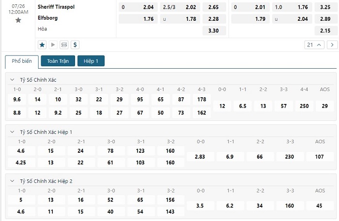 Bảng tỷ lệ kèo bóng đá trận đấu Sheriff Tiraspol vs Elfsborg