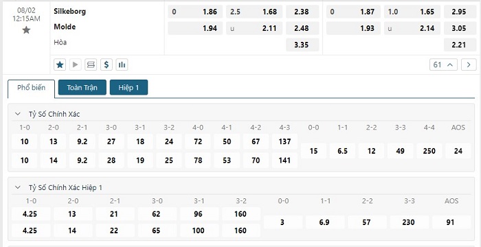 Bảng tỷ lệ kèo bóng đá trận đấu Silkeborg vs Molde