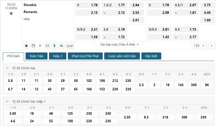 Bảng tỷ lệ kèo bóng đá trận đấu Slovakia vs Romania