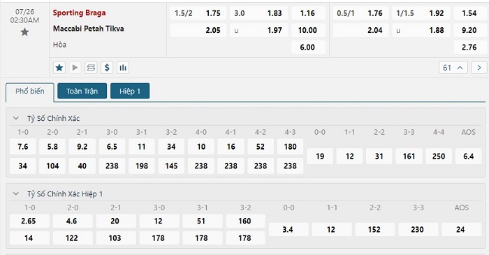 Bảng tỷ lệ kèo bóng đá trận đấu Sporting Braga vs Maccabi Petah Tikva