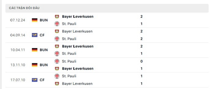 Trong những năm vừa qua St. Pauli vốn cũng từng gặp không ít những khó khăn trước Bayer Leverkusen, đội chủ nhà chỉ thắng 1, hoà 2 và thua 3 theo mốc kèo châu Âu được niêm yết ở những lần gặp nhau trước đó. Mùa giải hiện tại với Bayer Leverkusen họ vẫn đang có được thành tích bất bại trên sân khách mùa này với tổng cộng 9 trận thắng kèo châu Âu được niêm yết. Bởi vậy mà dù đang có được những lợi thế sân nhà nhưng với St. Pauli họ cũng sẽ khó có thể tránh khỏi một thất bại theo kèo Châu Âu